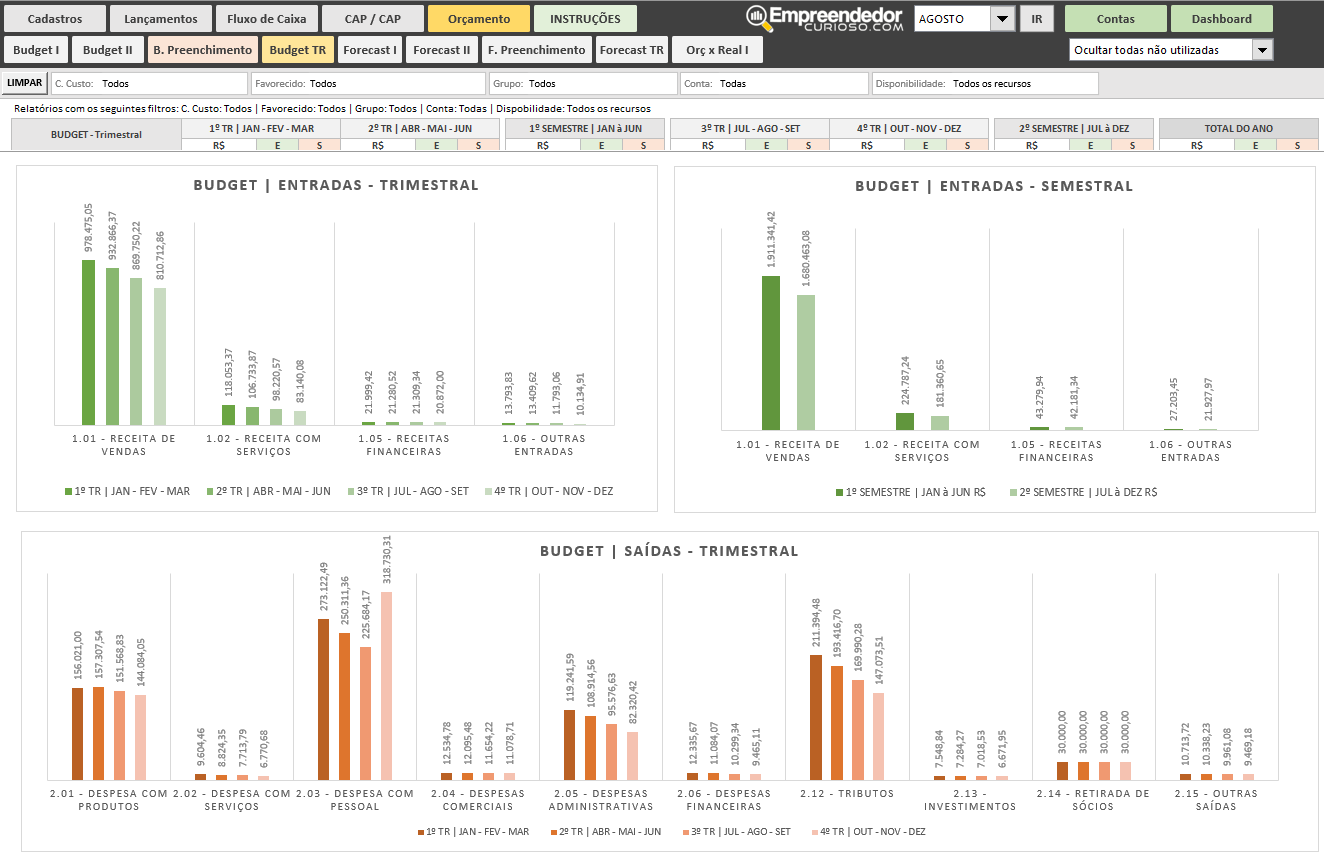 O budget da nossa planilha de controle financeiro é apresentado mensalmente de acordo com o seu plano de contas, ele poderá ser encontrado na aba de Orçamento e poderá ser visualizado trimestralmente na aba Orçamento TR.